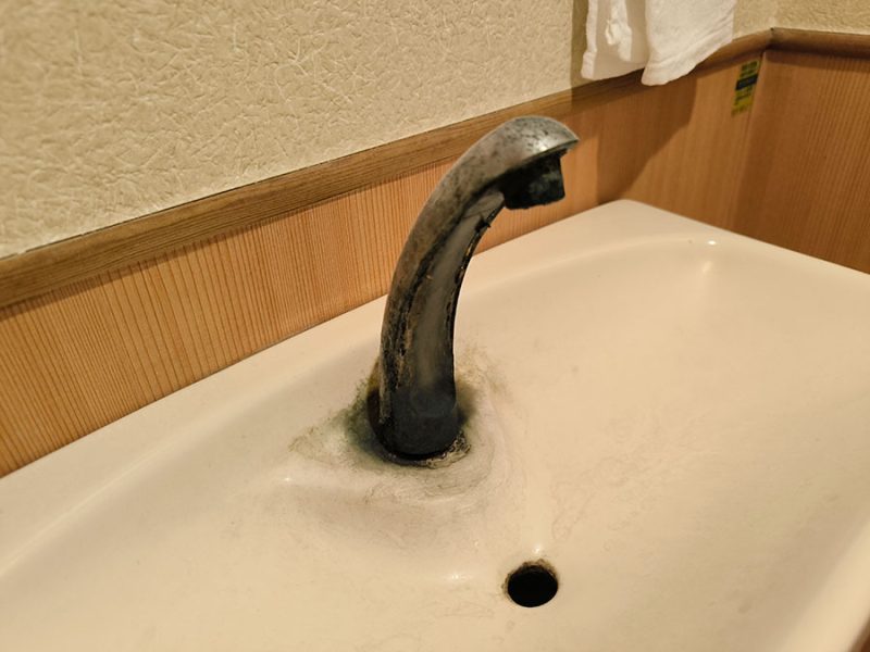トイレの水が出るところ、硫黄の成分の影響で黒くなっていました。