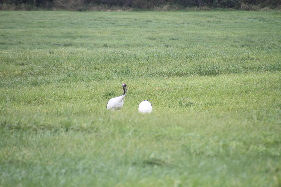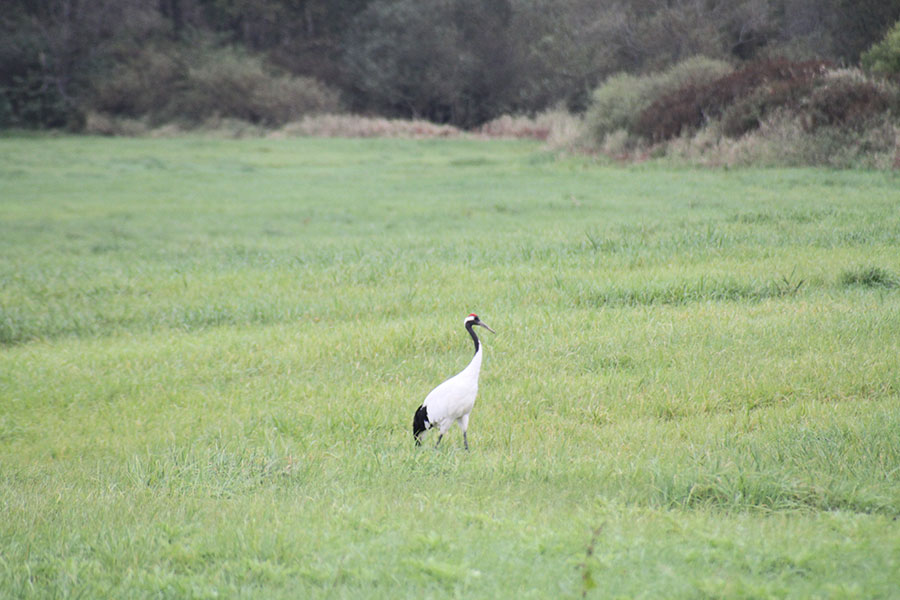 その途中の牧草地で、丹頂鶴を発見。