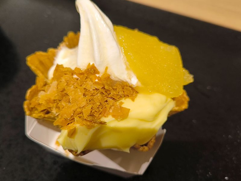 コーンのワッフルのお皿に、北海道産の生クリーム、北海道産のカスタードクリーム、北海道産…ではないリンゴ(青森産)のコンポートがのったスイーツです。