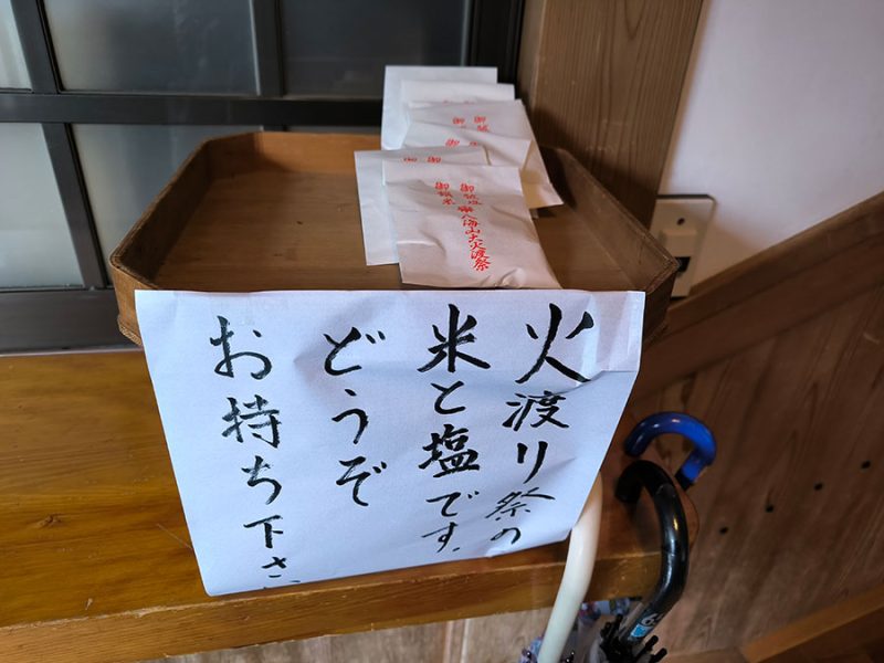 左手には、火渡り祭の米と塩を、無料で配ってました。