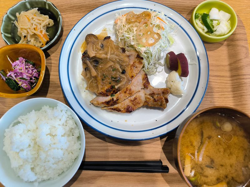 ポークソテーとご飯味噌汁、お漬物と小鉢二つが出てきました。なかなかのボリューム。